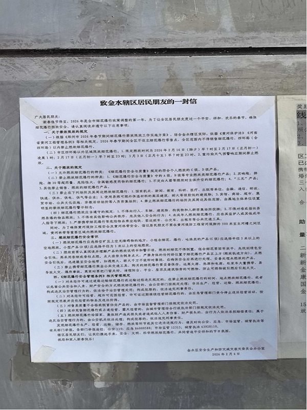 宣传工作中,国基路街道充分整合各类资源,实现线上线下同频共振。线下依托辖区LED电子屏滚动播放宣传标语,在小区出入口、主次干道等醒目位置张贴《致金水辖区居民朋友的一封信》;线上通过网格员微信群、社区公众号等平台,推送烟花爆竹安全燃放须知、政策解读及应急处置指南,网格员实时答疑解惑,确保宣传无死角、全覆盖。